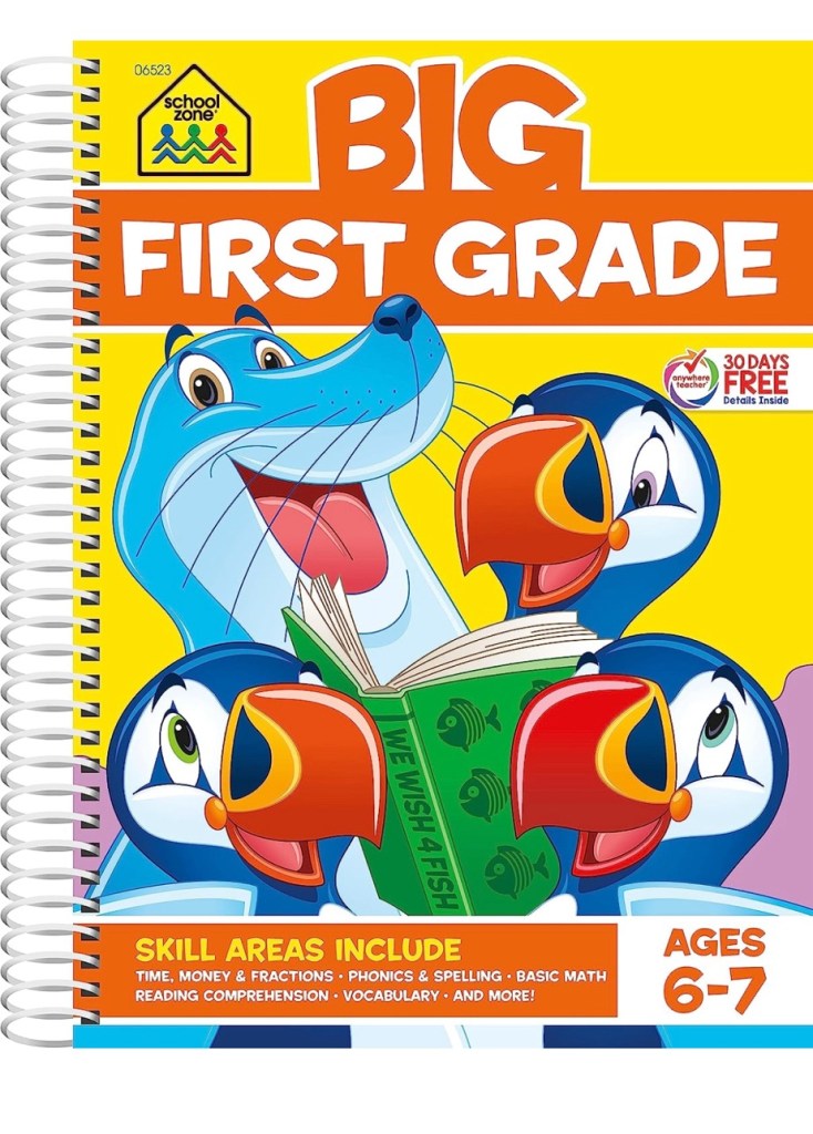 One of the books that was particularly beneficial is ‘BIG First Grade.’ This book exposes children to a wide range of question formats and topics, making it suitable for a gradual increase in difficulty. It covers alphabet, words, sentences, and gradually progresses to more challenging concepts like numbers, fractions, clocks, dates, and money. The book combines English and mathematics, making it easier for children struggling with English.