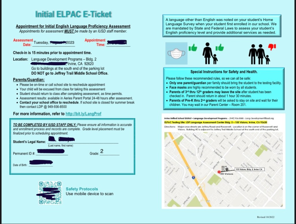 ELPAC covers four sections: Reading, Writing, Speaking, and Listening. The test is held in school district office by offline, with a teacher guiding and providing support. For younger students, it takes approximately 30 minutes. Parents can wait in a nearby classroom.